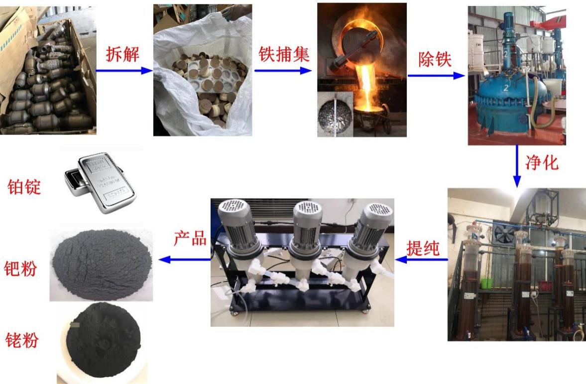 提出了低温铁捕集PGMs理论,突破了PGMs富集、分离提纯、污染减控等技术瓶颈,解决了废催化剂铂族金属绿色回收难题,铂族金属回收率98%以上,纯度99.95%以上。