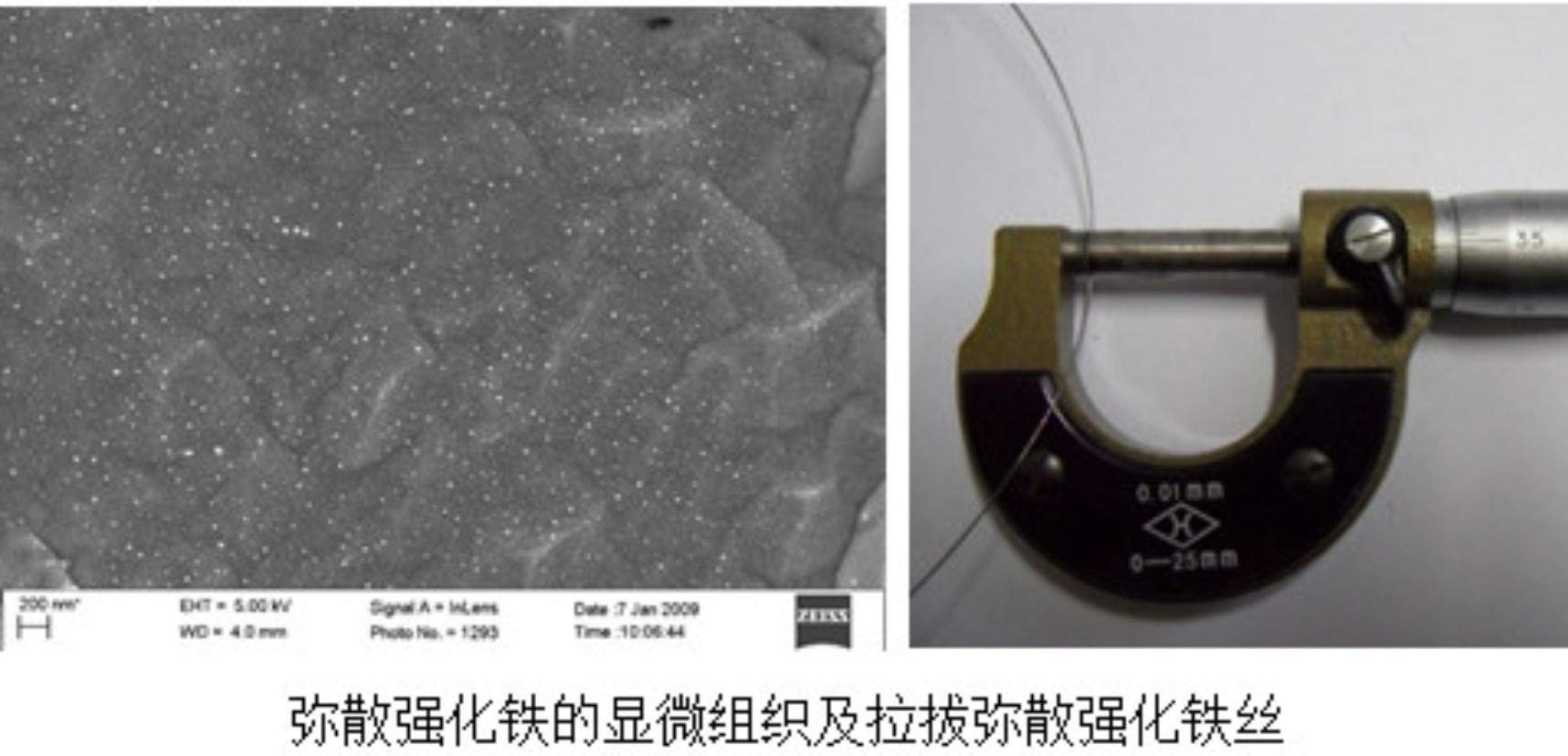 在弥散强化铁基材料方面,制备了氧化钇弥散强化纯铁和弥散强化钢。弥散强化纯铁室温抗拉强度达570MPa,比纯铁强度提高1倍以上。在此基础上制备了弥散强化低活化铁素体/马氏体钢,抗拉强度高达1200MPa,氧化物颗粒在基体中分布均匀,颗粒细小。