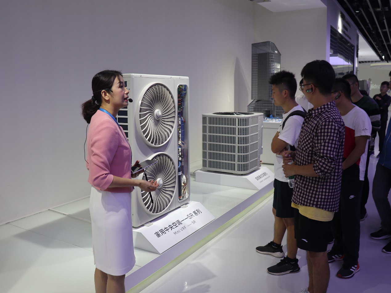 图为讲解员介绍美的集团自主研发的新一代家用中央空调