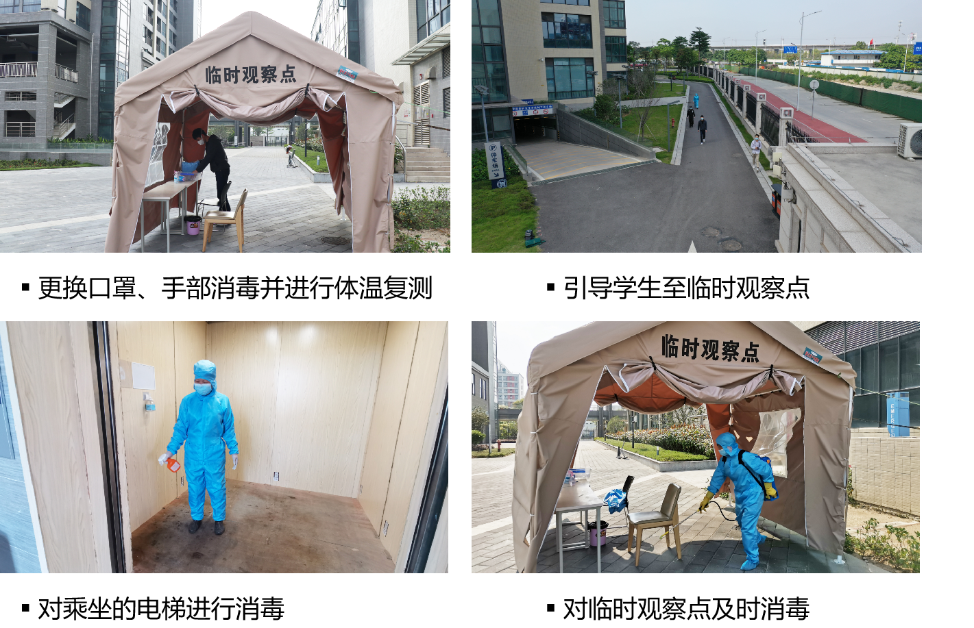 演练重点模拟了发现校内体温异常者的应急处理流程,对发现的体温异常的情况立即启动应急预案,辅导员立即上报后勤安保处,由着防护服的人员按照防疫防护要求,引导发热学生至临时观察点,让学生更换口罩,手部消毒并用水银体温计复测体温,开展登记询问和流行病学调查,转运发热患者到定点医院及时就诊,并按相关程序及时进行上报,迅速做好各环节应急处理。